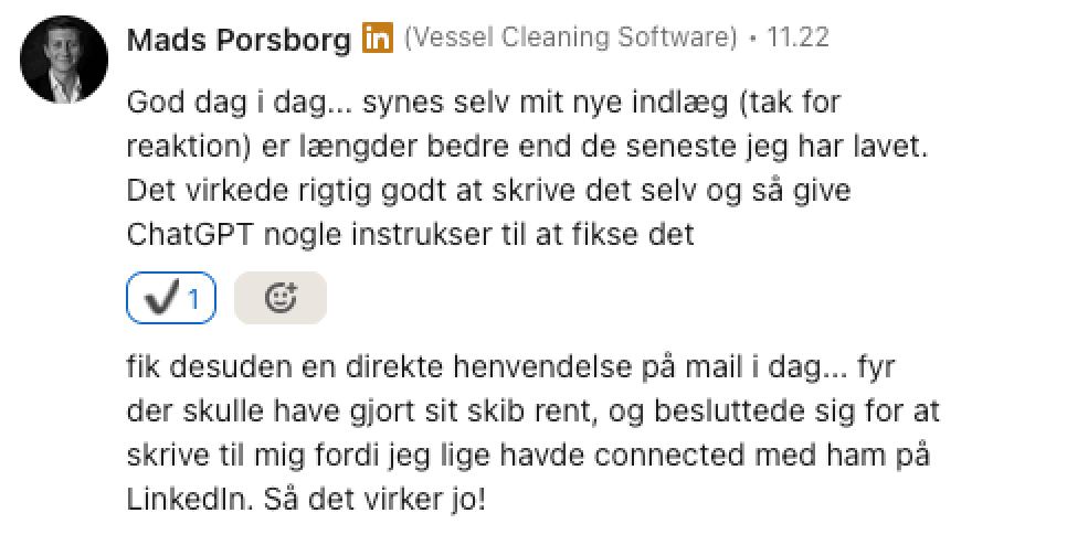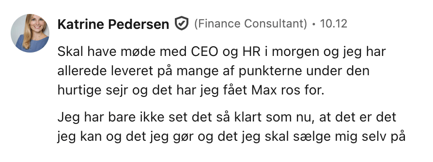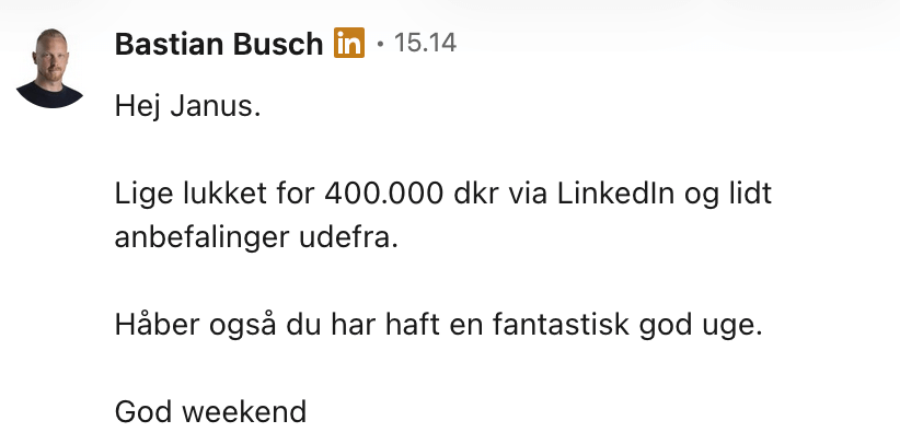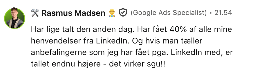 “Jeg undervurdrede hvor svært det var at komme i gang med selv at få potentielle kunder (leads) fra LinkedIn, men det lykkes med BrandOut SalgsSystem.”