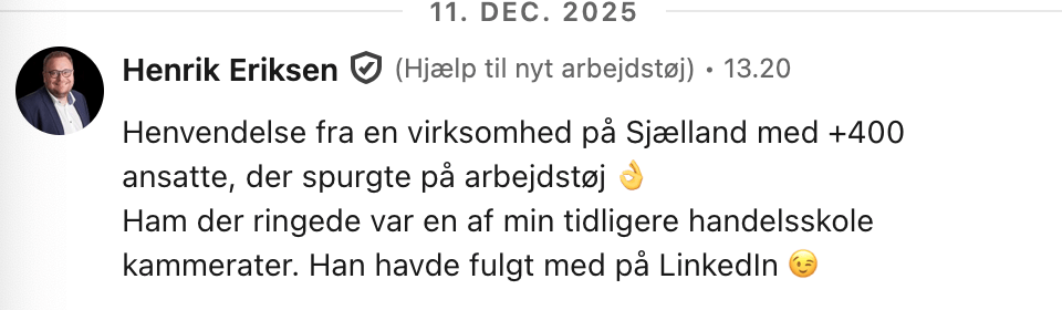 De resultater, der omtales her, er individuelle eksempler og er ikke nødvendigvis typiske. Resultater afhænger blandt andet af virksomhedens udgangspunkt, marked, indsats, implementering og timing. Oplysningerne deles med henblik på inspiration og dokumentation af erfaring – ikke som en garanti for et bestemt resultat. Din virksomheds resultater vil variere.